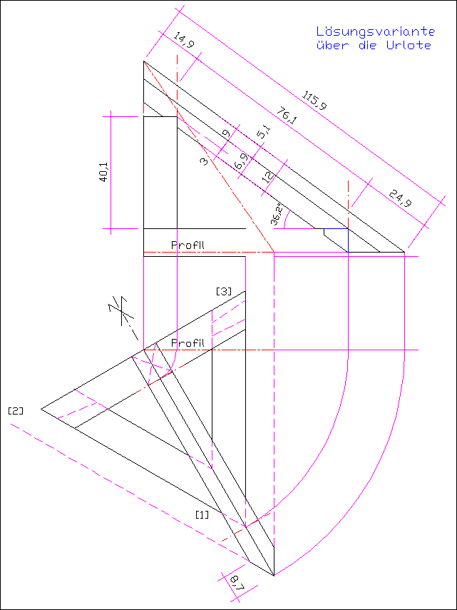 Gesellenprüfung 1997. Abb. Lösungansatz nach der Urlot-Methode.
