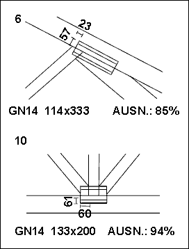 So wie in den beiden folgenden Bildern erstellt das Programm eine Detailauflistung aller Knotenpunkte des Binders. In den Detailzeichnungen sind die Lage und die Größe [GN14 114 x 333 (mm)] der einzelnen Nagelplatten genau dargestellt.