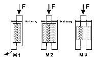 M1: Zweiteilige Kantholzanordnung mit jeweils einer Nagelplatte auf der Vorder- und Rückseite. Nachteil: Der asymmetrische Aufbau ließ sich schlecht unter die Prüfpresse (eine umgerüstete Biegezugpresse für Betonversuche) stellen. Es entstehen bei Belastung zusätzliche Drehmomente.