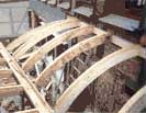 Die gewölbten Sparren wurden mit der Bandsäge aus Leimhölzern geschnitten, auf die die letztendliche Form mit zuvor gefertigten Schablonen aus Schalbrettern, die bereits als Modell zusammengesetzt vor Ort eingepasst worden waren, übertragen wurde. Auf die Sparren wurden in gleicher Breite Schalbretter aufgeschraubt, die alle fünf Zentimeter eingeschnitten waren, um sie leichter der Wölbung der Sparren anzupassen. Die Schalung des Daches erfolgte mit eigens keilförmig geschnittenen Schalbrettern, da eine Seite des Daches durch die Wölbung über einem nicht rechtwinkligen Grundriss deutlich länger war als die andere. Dies erleichterte die Schalung des Daches vor Ort sehr, da die Schalung nicht schräg verlief und keine Schmiegen mehr angeschnitten werden mussten.