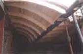 Zunächst wurde ein Stahlträger in der Flucht der Regenrinne auf eine rückwärtige Mauer und eine Stahlstütze aufgelagert. An diesen Träger wurden die gewölbten Sparren auf den Untergurt aufgelagert und mit Schlüsselschrauben mit den Laschen verbunden, die im Abstand des Bundmaßes beidseitig an den Träger angeschweißt waren. Die anderen Enden der Sparren waren mit Schrauben an Bohlen angeschlossen, die wiederum mit dem Fachwerk der beiden bereits bestehenden Gebäude verbunden wurden.