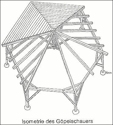 Die sechs Gratsparren bei diesem Göpelschauer münden mit einer Zapfenverbindung in einen hübsch gestalteten sechseckigen Kaiserstiel (Hängesäule). Die jeweiligen Felder werden durch 5 Schifter (mit jeweils einem Mittelschifter) gebildet. Die Gratsparren sind zusätzlich durch Streben unterstützt. Die Steifigkeit des Fußpfettenkranzes wird durch Kopfbänder in drei Ebenen erreicht. Das Prinzip erkennt man sofort, wenn man einen aufgespannten Regenschirm auf die Enden seines Gestänges stellt.