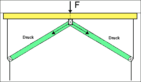 Beim einfachen Sprengwerk wird die Last F über die Sprengstreben abgefangen und als Druckkraft auf ein Widerlager übertragen. Die unterstützende Konstruktion liegt also unterhalb der aufzunehmenden Last. Der Brückenträger (gelb) wird im wahrsten Sinne des Wortes unterstützt. Die beiden Streben (grün) sind hier an einem querliegenden Rähm angeschlossen, da es sich ja um eine kleine Brücke mit gewisser Gehwegbreite handelt. Im Falle des Göpelschauers münden die Sparren punktuell in den Kaiserstiel. - Das Prinzip ist generell gleich.